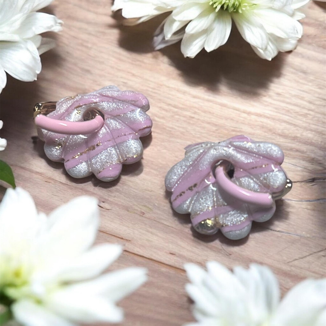 Craquer pour cette jolie Paire , douce et élégante, coquillage interchangeable 2 cm de diamètre en argile polymère. Les créoles sont en acier inoxydable, fait main en Gironde France.