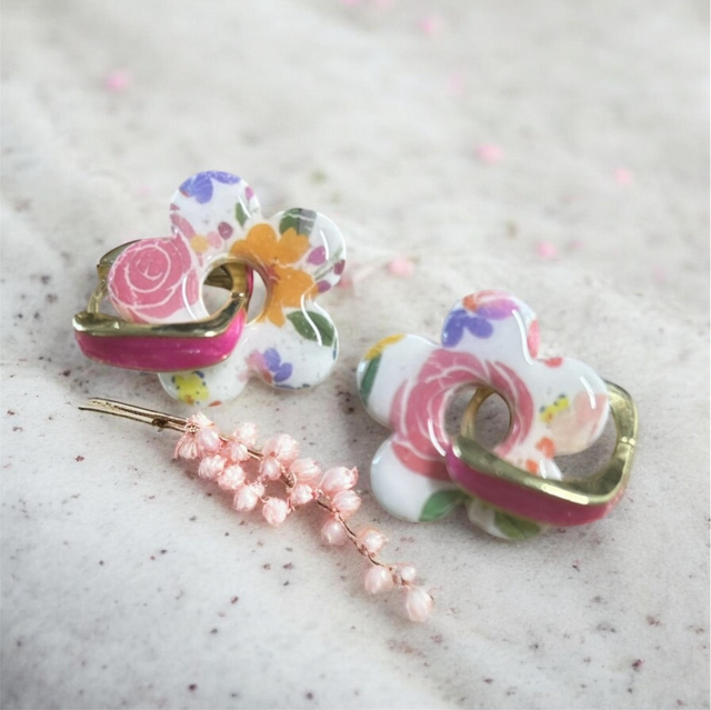 Ces boucles d’oreilles fleuries, composées de pampilles interchangeables et de créoles en acier inoxydable d’un diamètre de 2 centimètres, sont entièrement fabriquées à la main en Gironde.