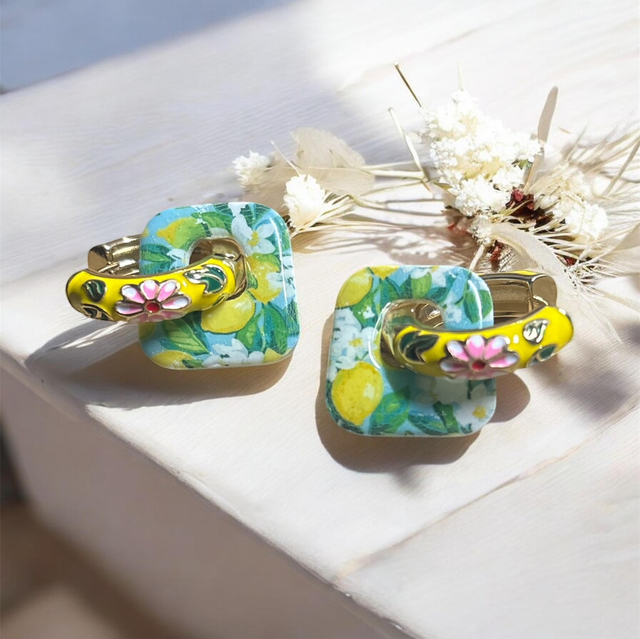 Chaque paire est unique : les pampilles sont réalisées artisanalement avec un motif citron et fleurs aux couleurs vives, pour un rendu à la fois joyeux, estival et élégant.